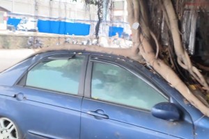 男子停车后后座放东西,旁边车子碰到车门导致男子腿部被夹